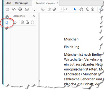 Am linken Rand des PDFs sehen Sie Miniaturansichten der Seiten, Lesezeichen und Anhänge. Die Lesezeichen entstehen entweder aus der Ursprungsdatei (wie aus einem Worddokument) oder werden direkt in Acrobat DC erstellt.