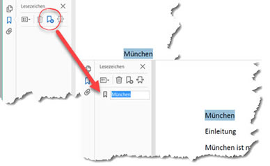 Markieren Sie den Text im PDF und wählen Sie das Symbol "Neues Lesezeichen" oder drücken Sie STRG+B. Nachdem das Lesezeichen angezeigt wird, drücken Sie ENTER.