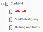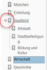 Das Minuszeichen vor dem Hauptlesezeichen (hier "Stadtbild") klappt alle Unterpunkte ein. Sie können mit dem anschließenden Pluszeichen alles wieder aufklappen. Mit dem Symbol "Optionen"