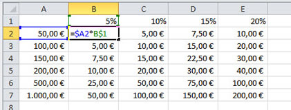 Wie muss die Formel für die Prozentberechnung aussehen, damit Sie die Formel nur einmal schreiben müssen und dann nach unten und rechts ausfüllen können?