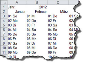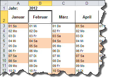 Der Jahreskalender ist jetzt fertig für alle Jahre. Tippen Sie statt 2012 ein anderes Jahr in B1 und Sie erhalten den Kalender für dieses Jahr oder verwenden Sie die Formel =JAHR(HEUTE()), um immer das aktuelle Jahr zu ermitteln.