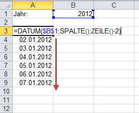 - dann schreibe das Datum (DATUM($B$1;SPALTE();ZEILE()-2)