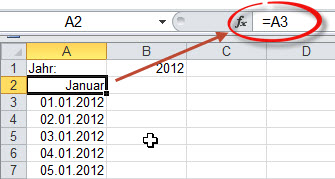 Schreiben Sie in A2 nur den Bezug =A3 - damit wird zuerst genau das gleiche wie in Zelle A3 geschrieben: das Datum 01.01.2012 erscheint hier erneut. Lassen Sie A2 markiert und rufen Sie auf Start / Zahl / Benutzerdefiniert und geben Sie ein MMMM. Das bedeutet, dass das Datum nur als Monatsname ausgegeben werden soll.