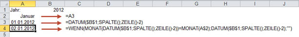 - In A2 steht der Monat Januar, ermittelt mit =A3