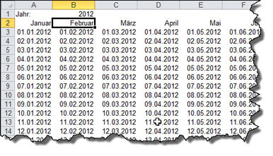 Markieren Sie die Zellen von A2 bis A33 (dort sollte der 31.01.2012 stehen). Zeigen Sie wieder auf das Ausfüllkästchen und ziehen Sie jetzt alles gemeinsam nach rechts, bis Sie den Dezember erreichen. Wenn es zu viele Monat werden, löschen Sie später die überzähligen Spalten.