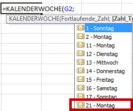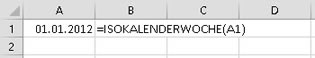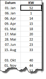 In der linken Spalte steht das Datum, rechts davon die deutsche Kalenderwoche. Die Funktion lautet: =KALENDERWOCHE(Datum;Rückgabe) =KALENDERWOCHE(A1;21) Der Wert "Rückgabe" ist wichtig, um die verschiedenen Normen in den Ländern zu berücksichtigen. In einigen Ländern ist die erste Kalenderwoche die mit dem 01. Januar - in Deutschland ist es die erste Vier-Tage-Woche. Das wird mit der "21" eingestellt. |