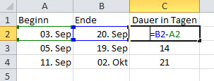 Der Beginn steht in A2, das Ende in B2. Die Differenz errechnt sich mit: =B2-A2 |