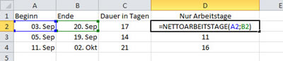 Dabei werden die Wochenenden mitgezählt. Um nur Arbeitstage zu berechnen, verwenden Sie die Funktion "NETTOARBEITSTAGE".