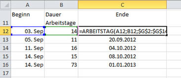 =ARBEITSTAG(Beginn;Dauer; Freie Tage) =ARBEITSTAG(A12;B12;$G$2:$G$14) |