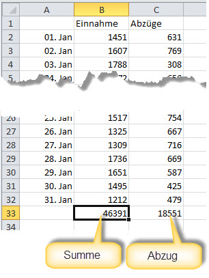 Links sehen Sie das Tabellenblatt für den Januar, der Blattname ist "Januar". Zelle B33 soll den Namen "summe", Zelle C33 den Namen "Abzug" erhalten. Markieren Sie Zelle B33 und rufen Sie "Formeln / Namen definieren" auf. |