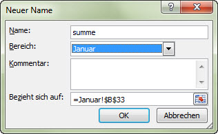 Tippen Sie den Zell-Namen "summe" ein, bestimmen Sie als Bereich das Tabellenblatt "Januar" - nicht die gesamte Arbeitsmappe! Kontrollieren Sie, dass er sich auf die richtige Zelle bezieht.