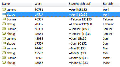 Im "Namensmanager" sehen Sie alle Namen, die Sie in der Arbeitsmappge verwenden und worauf sich die Namen beziehen. Es muss immer so sein, dass pro Blatt (Januar, Februar etc.) ein Name für Summe und Abzug vorhanden ist. |
