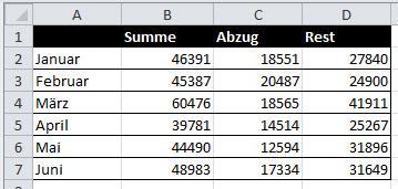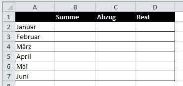 Auf dem Blatt "Zusammenfassung" erstellen Sie zuerst das Grundgerüst - in die Spalte A schreiben Sie die Monatsnamen, in die Zeile 1 schreiben Sie "Summe" und "Abzug". Die Spaltenbeschriftung muss mit den Namen, die Sie vergeben haben, übereinstimmen. Allerdings stört sich Excel nicht an unterschiedlicher Groß- und Kleinschreibung.