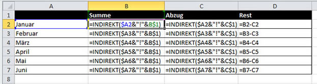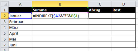 =Januar!Summe - Damit beim Kopieren nach unten der Bezug immer auf die erste Zeile weist, wird in B1 die Zeile fixiert: B$1