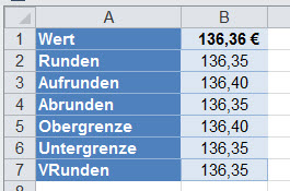 Rechts sehen Sie die Ergebnisse der Berechnungen. Wenn Sie auf 50 Cent genau berechnen wollen, ersetzen Sie bei RUNDEN, AUF- und ABRUNDEN die "5" durch "50". Bei OBER- und UNTERGRENZE sowie bei VRUNDEN ersetzen Sie die "0,05" durch "0,5". |
