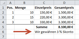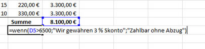 =WENN(D5>6500;"Wir gewähren 3 % Skonto";"Zahlbar ohne Abzug")