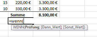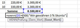 Jetzt kommt der DANN-Wert, der ein Text ist. Darum muss er in Anführungszeichen eingeschlossen sein. Tippen Sie "Wir gewähren 3 % Skonto" und schließen Sie wieder mit dem Semikolon ab. |