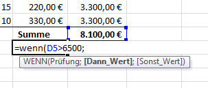 Das ist in unserem Fall die Zahl in D5. Sie soll größer 6500 sein. Tippen Sie D5>6500 und schließen Sie mit einem Semikolon die Prüfung ab.