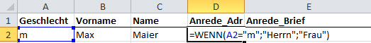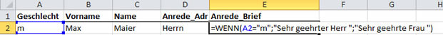 =WENN(A2="m";"Sehr geehrter Herr ";"Sehr geehrte Frau ") |