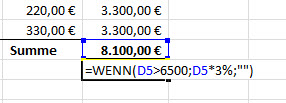 Klicken Sie in D6 und schreiben Sie die Formel =WENN(D5>6500;D5*3%;""). Die 3% werden nur ausgerechnet, wenn der Wert in D5 höher ist 6.500 Euro. |