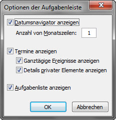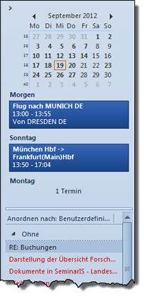 Die Aufgabenleiste wird im Posteingang auf der rechten Seite angezeigt. Sie besteht standardmäßig aus dem Monatsblock, den Terminen und den Vorgängen. Klicken Sie auf "Ansicht / Aufgabenleiste", um sie anzupassen. Sie können die Ansicht "Normal" (wie das Bild nebenstehend) sehen, minimiert (eine schmale Leiste) oder aussschalten. Wenn die Aufgabenleiste eingeschaltet ist, können Sie entscheiden, ob Sie den Datumsnavigator (der Monatsblock), die Termine und die Aufgabenliste anzeigen oder nicht. |