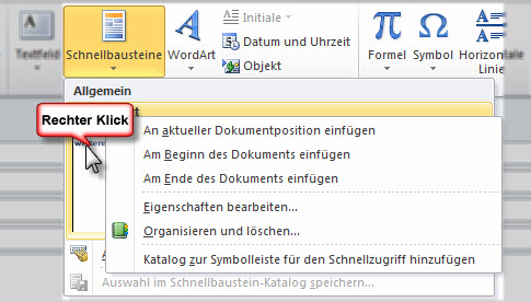 Aufgerufen werden Schnellbausteine mit dem gleichen Menü: "Einfügen / Schnellbausteine" - die Bausteine werden oben bereits angezeigt. Mit einem Klick wird der Bausteintext an Stelle des Cursors eingefügt.