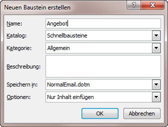 Bausteine brauchen einen Namen, mit dem sie später aufgerufen werden. Texte sind am besten im Katalog "Schnellbausteine" aufgehoben, Sie können aber auch andere Kataloge wählen. Einige Kataloge haben eigene Symbole zum Aufrufen, so werden beispielsweise Einträge aus dem Katalog "Tabellen" unter "Einfügen / Tabelle / Schnelltabellen" angezeigt. |