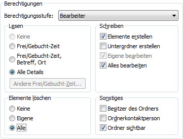 Es ist ratsam, die Rechte in den Rubriken "Lesen", "Schreiben" und "Elemente löschen" einzeln zu vergeben. Die Berechtigungsstufe wird dann automatisch eingestellt. Im Verhältnis Sekretariat - Chef sind sinnvoll: