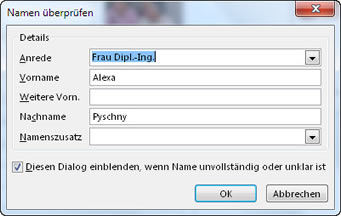 Mit Klick auf "Name" öffnet sich der Dialog "Namen überprüfen". Im Feld "Anrede" wird die Anrede Herr oder Frau eingetragen, gefolgt vom Titel.