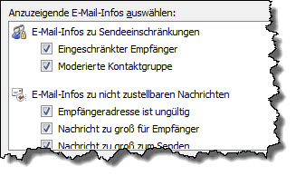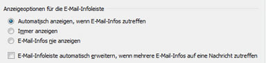 Welche Informationen das sind, sehen Sie im Befehl "Datei / Optionen / E-Mail / Optionen für E-Mail-Infos". Sie können hier auch bestimmen, dass Sie einige Informationen nicht sehen wollen. Nehmen Sie einfach die Häkchen heraus. |