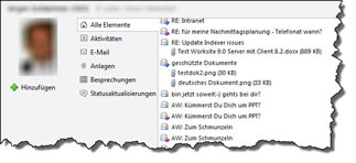 Beispielsweise können Sie sich hier anzeigen lassen, welche Mails bereits mit diesem Empfänger gewechselt wurden oder ob Sie Besprechungen gemeinsam haben bzw. hatten.
