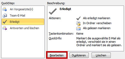 Zum Bearbeiten vorhandener Quicksteps klicken Sie auf den kleinen Dialog-Launcher-Pfeil, um den Dialog "QuickSteps verwalten" aufzurufen. Markieren Sie einen Quickstep und klicken Sie auf "Bearbeiten".