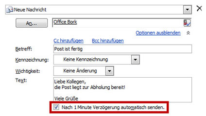 Tragen Sie Betreff und Text ein - eventuell noch Kennzeichnung oder Kategorie. Ich rate dazu, die einminütige Verzögerung zu aktivieren! Sonst haben Sie nie eine Chance, etwas zu korrigieren oder abzubrechen. Mit dieser Verzögerung landet die Mail erst einmal für eine Minute im Postausgang, anderenfalls wird sie sofort versandt. |