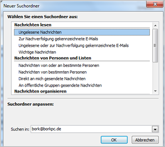 Suchordner sind abgespeicherte Suchen nach bestimmten Mails - zum Beispiel alle Mails von und an einen bestimmten Partner oder alle Mails mit einer bestimmten Kategorie.