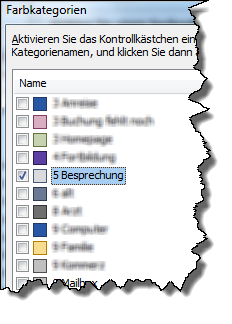 Klicken Sie auf "Auswählen" und markieren Sie die Farbkategorie. Wenn Sie mehrere Kategorien markieren, ist das eine ODER-Verknüpfung. Das bedeutet, dass die Mail nicht beide Kategorien zugleich haben muss, sondern dass sie entweder "Kategorie A" oder "Kategorie B" zeigen muss. Bestätigen Sie die Auswahl mit OK und die Anlage des Ordners mit OK. |