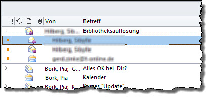 Oben sehen Sie eine aufgeklappte Unterhaltung zu meiner Bibliotheksauflösung, darunter eine nicht geöffnete Unterhaltung mit dem Betreff "Alles OK bei Dir?".