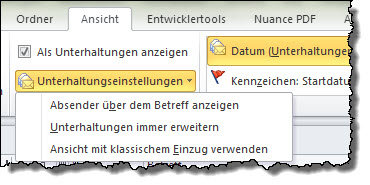 Ein Fehler ist eindeutig, dass die Unterhaltungen nie aufgeklappt bleiben - egal, ob "Unterhaltungen immer erweitern" aktiviert ist oder nicht. Outlook 2010 klappt immer wieder alles zu. |