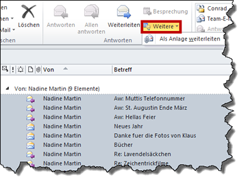 Markieren Sie die Mails, die gemeinsam weitergeleitet werden sollen. Klicken Sie dann unter "Start / Antworten" auf "Weitere" und wählen Sie "Als Anlage weiterleiten". |