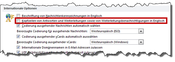 Klicken Sie auf "Datei / Optionen" und dort auf "Erweitert". Rollen Sie nach unten bis zu "Internationale Optionen". Ein Häkchen bei "Kopfzeilen von Antworten und Weiterleitungen ... in Englisch" führt dazu, dass Sie "FW" und "RE" vor dem Betreff erhalten. Ohne Häkchen steht dort "WG" und "AW".