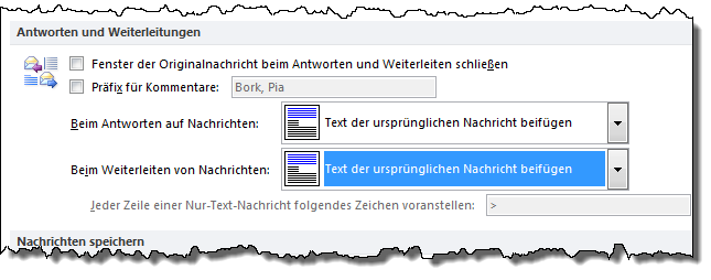 Klicken Sie auf "Datei / Optionen / E-Mail", rollen Sie nach unten bis zu "Antworten und Weiterleitungen".