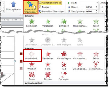 Markieren Sie das Diagramm und wählen Sie "Animation hinzufügen". Wählen Sie aus "Beenden / Verschwinden".