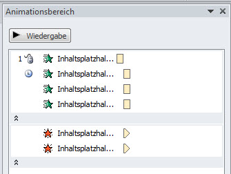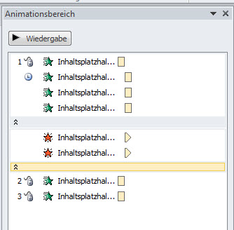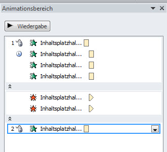 Klicken Sie im Animationsbereich auf den grauen Balken unter der Animation. Sie sehen jetzt vier Animationen. Setzen Sie den Mauszeiger auf die einzelnen Balken "Inhaltsplatzhalter" (nicht klicken!), um zu sehen, was hier animiert wird. Von oben nach unten sollte es sein: Hintergrund, Datenreihe 1, Datenreihe 2, Datenreihe 3. |