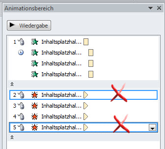 Für die restlichen zwei Zeilen (Datenreihe 1 und 2) weisen Sie als Start zu "Mit vorheriger". Jetzt sehen Sie insgesamt sechs Animationen: vier Eingangs- und zwei Ausgangsanimationen.