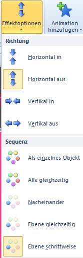 Markieren Sie das SmartArt und wählen Sie eine passende Eingangsanimation. Klicken Sie dann auf die "Effektoptionen", wählen Sie zuerst die Richtung (falls das bei Ihrer Animation vorgesehen ist). Dann bestimmen Sie, in welcher Reihenfolge die Elemente gezeigt werden - "Als einzelnes Objekt" ist der Standard. Je nach Typ des SmartArts werden mit "Nacheinander", "Ebene schrittweise" und "Ebene gleichzeitig" die einzelnen Elemente Stück für Stück aufgebaut. Im Animationsbereich können Sie noch einrichten, mit welcher Dauer die Elemente erscheinen und ob Sie noch einzelne Elemente mit "Mausklick" erscheinen lassen wollen. Ein Umsortieren ist leider nicht möglich. |