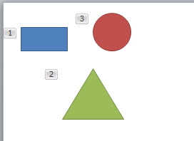 Drei Elemente auf der Folie werden animiert: mit dem ersten Mausklick erscheint das blaue Rechteck, Mausklick Nr. 2 ruft das grüne Dreieck und Klick Nr. 3 den roten Kreis auf den Plan. Die Zahlen werden angezeigt, wenn Elemente animiert sind und das Register "Animationen" aktiviert ist. |