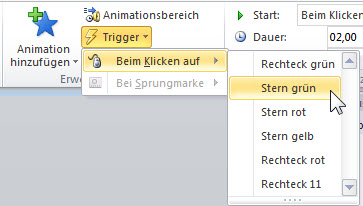 - Reckteck rot: Eingangsanimation zuweisen, dann "Trigger / Beim Klicken auf: Stern rot"