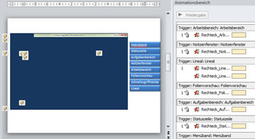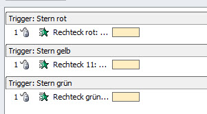 Im Animationsbereich werden die Trigger mit den Rechtecken angezeigt. Trigger, also Auslöser, ist jeweils der Stern. Er löst die Animation für das entsprechende Rechteck aus. |