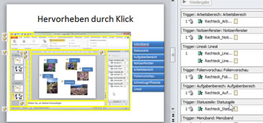 Die gleiche Folie mit Umrandungen auf Mausklick - beim Klick auf die Beschriftungen am rechten Rand wird das entsprechende Element gelb umrandet.