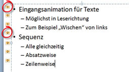 Eine Eingangsanimation bedeutet, dass die Folie anfangs leer ist und sich Mausklick für Mausklick mit Texten füllt. Das Symbol ist ein grüner Stern. Blenden Sie sich den Animationsbereich (3) ein (Animationen / Animationsbereich) - das ist praktischer.