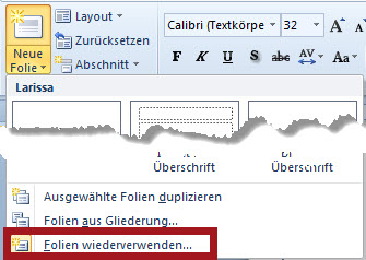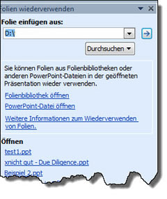Viele Anwender finden den Befehl nicht, mit dem sie Folien aus einer anderen Präsentation einfügen können. Er hat in der Tat einen Namen bekommen, den man nicht auf Anhieb einordnen kann ;-)